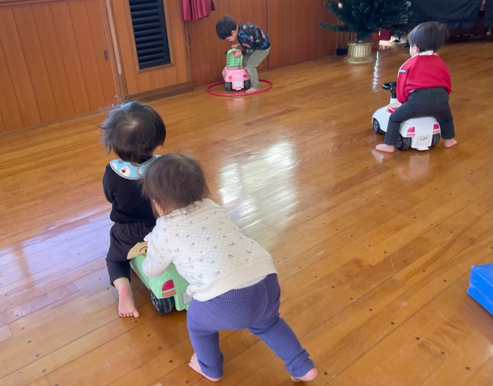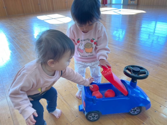 年下の友達へ「一緒に遊ぼう」と声を掛けたり、ホールでは車を押してあげたりお世話をしてあげる姿が見られるようになってきました!