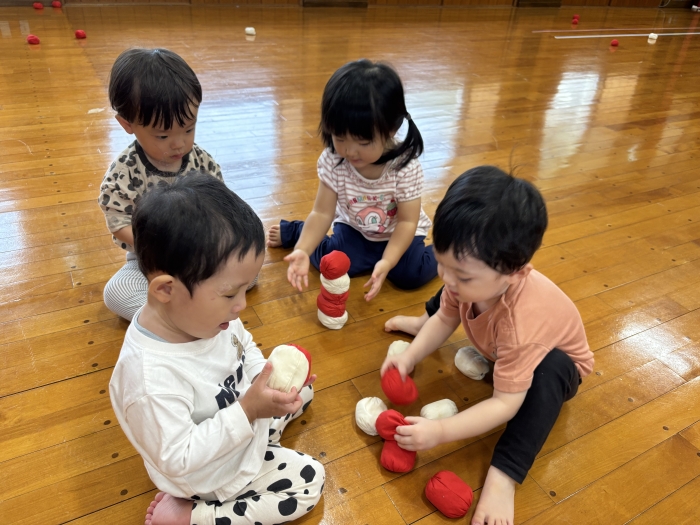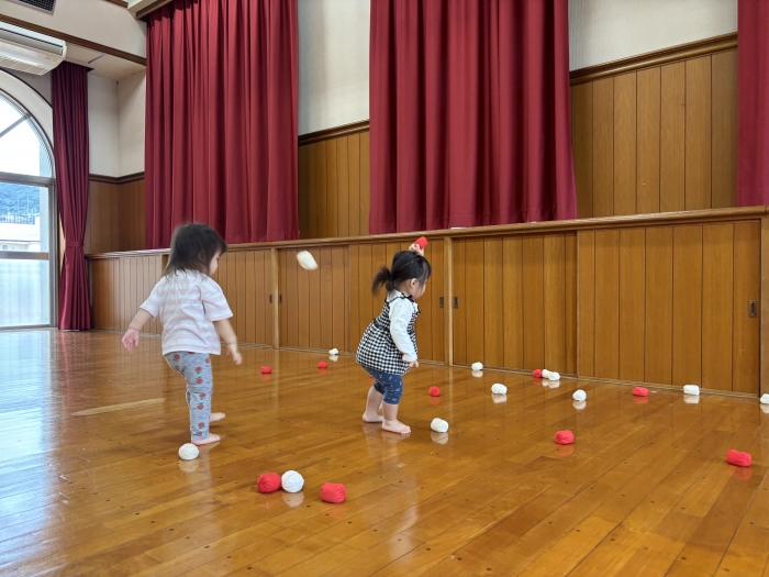 少しずつ投げる力もついてきて、転がったお手玉を追いかけながら笑顔いっぱいでした♡