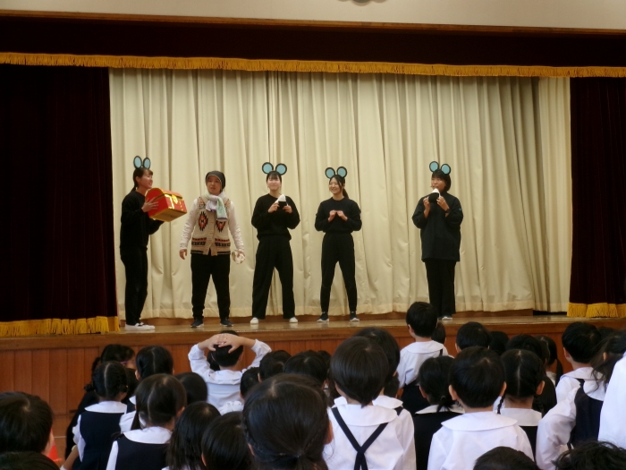 今日は、ホールで職員劇「おむすびころりん」がありました。