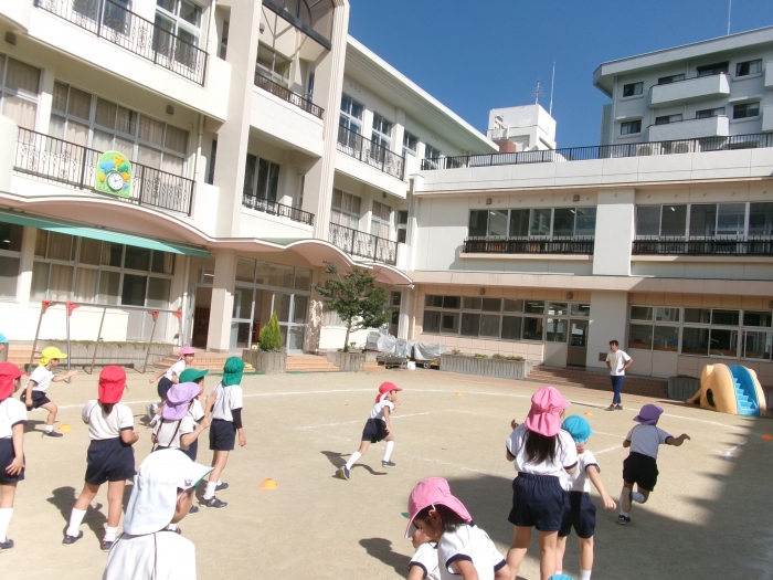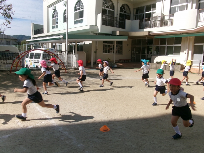 久しぶりの園庭での活動に嬉しそうな子ども達。3チームに分かれてスキップをしたり後ろ走りをしたり様々な種類のリレーを楽しみました。