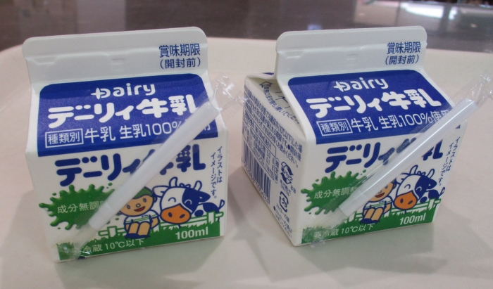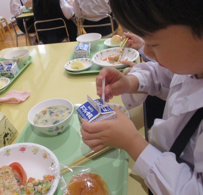 今まで給食の時間の牛乳はコップに入っていたので、A組だけ特別な牛乳にちょっとワクワクしているようでした。