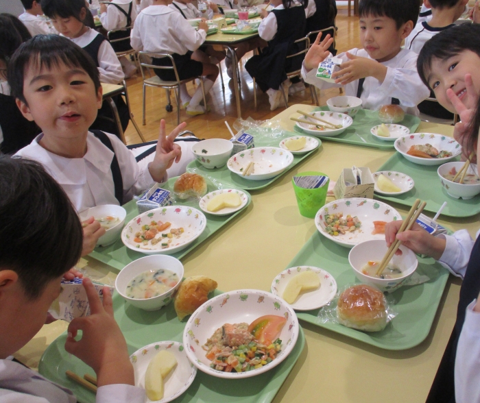 小学校では給食の時間に1人1本牛乳があります。小学校で牛乳に苦戦しないために、A組は練習もかねて、今日の給食は1人1本牛乳がつきます。