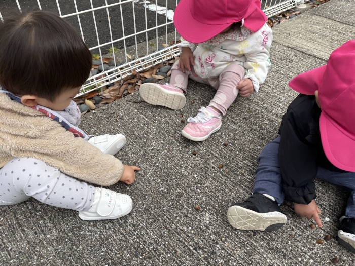 どんぐりを見つけると、1つずつ小さな手でつまんで拾う姿がとても可愛かったです♡