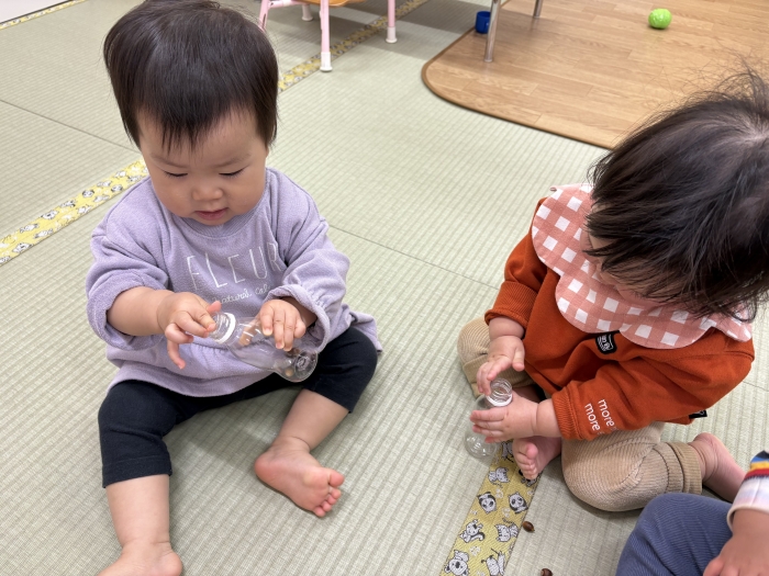 拾ってきたどんぐりを容器に入れて蓋を閉め、マラカスを完成させると、みんなでシャカシャカ!と全力で振ったり、容器の中にあるどんぐりを観察したり…秋を感じながら楽しみました☆