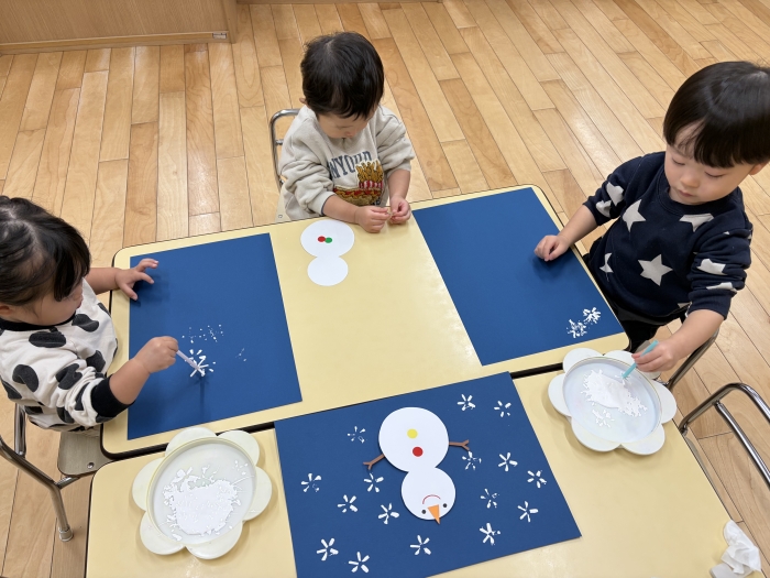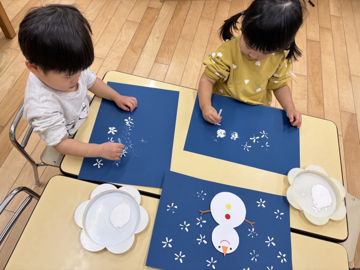 ストローでポンポンと白い絵の具を押していくと、雪が降っているような模様が広がり、子どもたちは「ゆきだ~!」と夢中で取り組んでいました☆