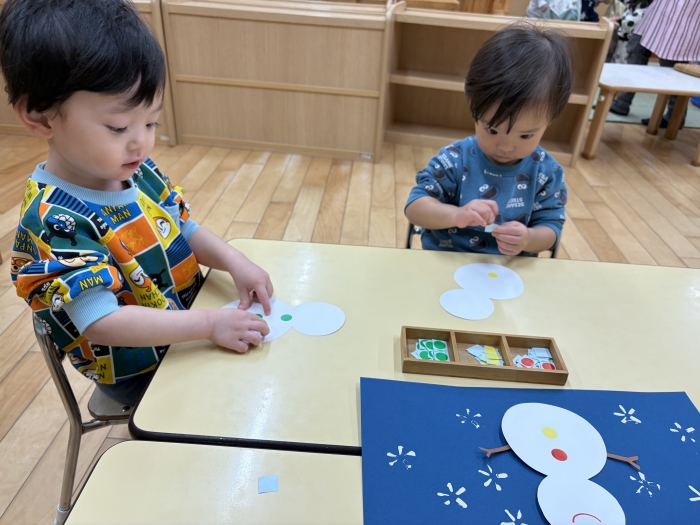 雪だるまのボタンも好きな色のシールを選んで貼り、冬らしいかわいい作品ができました♡