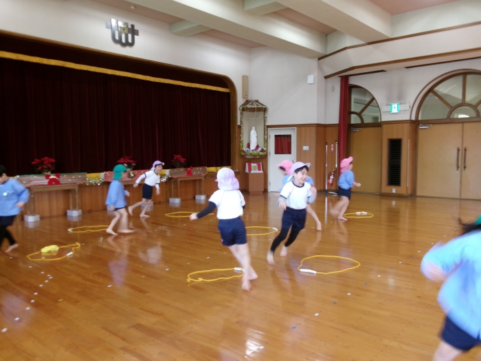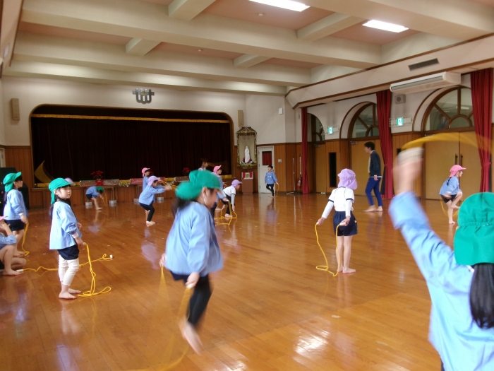 前跳びや後ろ跳びにも挑戦し、連続跳びができるようになると「見て見て~」「連続で跳べたよ!」など自分の成長に興奮ぎみのA組でした♪