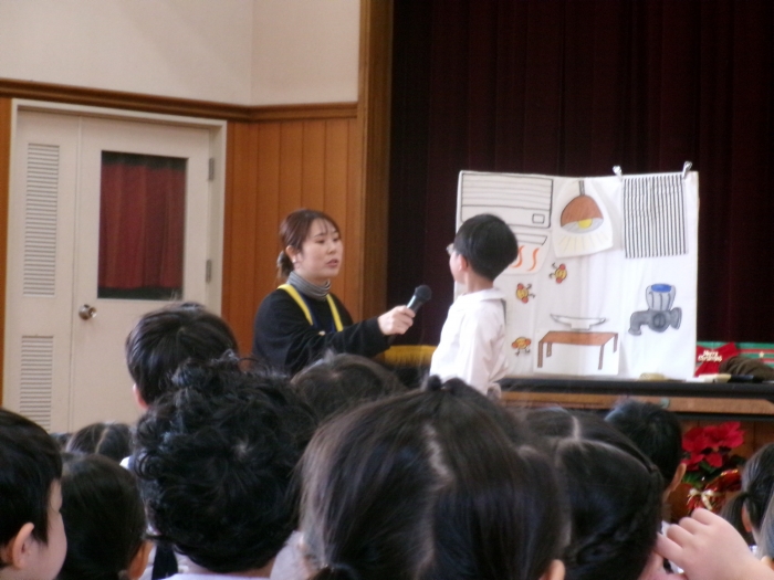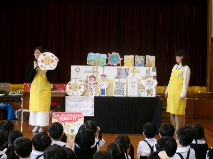 今日はエコマザーさんによるお話がありました。電気や冷蔵庫、テレビをつけっぱなしにしているとCO2が発生し、CO2が増えると大雨が降ったり、地球が暑くなったりするという内容でした。子ども達からは「自分でできることだった!」と声が上がりました。みんなで心がけて地球を大切にしましょう。