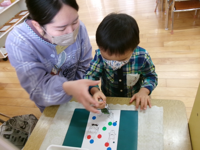 さくらんぼタイムも行われ、節分の絵本を読んだり、豆まきの掛け声を練習したり…最後は、お正月遊びの福笑いにチャレンジ!「鼻はどこかな~?」「ここじゃない!?」等、お互いに声を出して、楽しい時間を過ごすことができました。