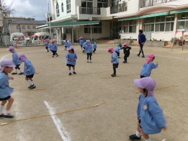 寒さも気にならないくらい、縄の周りを走ったり前跳びや後ろ跳びに挑戦したりと、元気いっぱいの子ども達でした♪