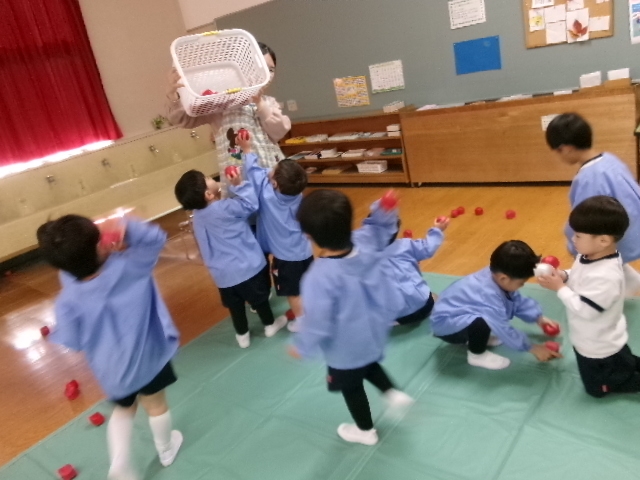 今日は、玉遊びをしました。玉を紹介すると「さわりた~い!」と目を輝かせてワクワクしていました。玉を上に投げたり、頭にのせたりして沢山玉に触れ楽しみ、玉入れでは、かごに入れようと真剣な表情でチャレンジしていましたよ♪