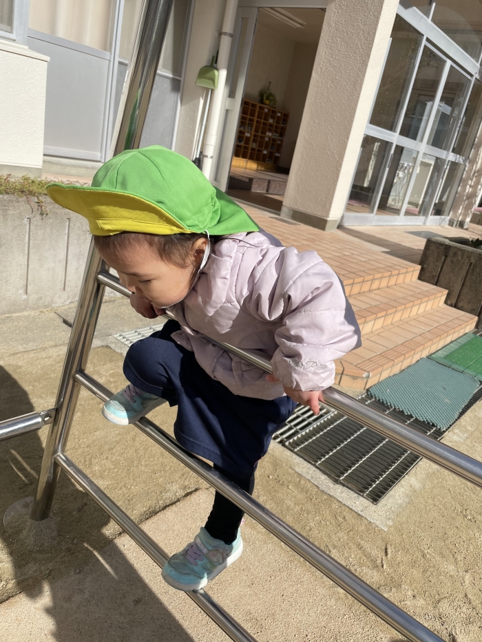今日は、園庭で遊びました。お友だちと縄を回してみたり、手を繋いで滑り台を滑ったり・・・