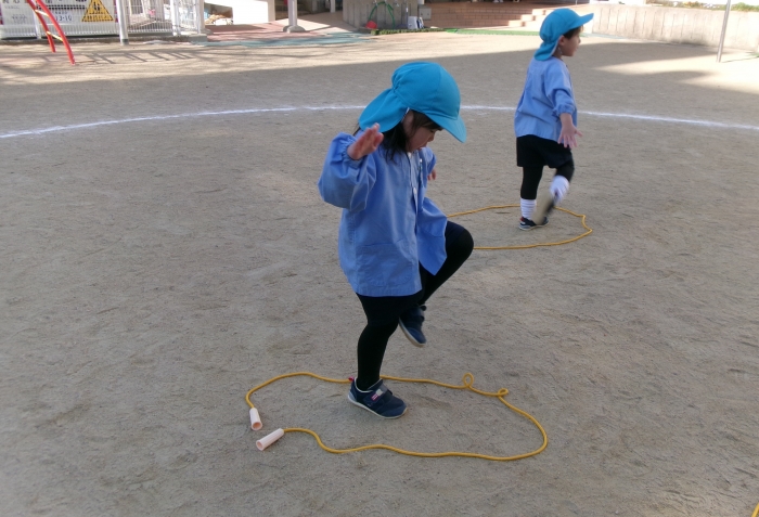 縄跳びを使ってジャンプや魚釣り、荷物(ボール)の配達など様々な活動をしました♪