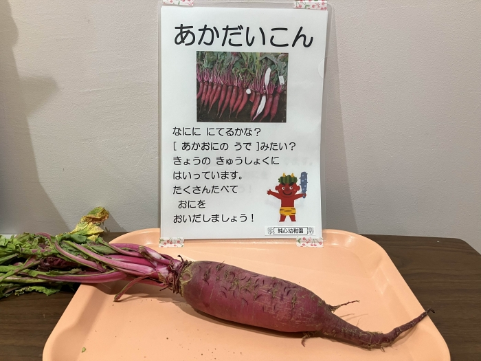 展示してある紅大根に興味深々の子ども達でした。食べ終わって「だいこん、からかったー!」と、園では大根は加熱して使用する事が多い為、生の大根独特の辛味に少しびっくりした様子もありました。