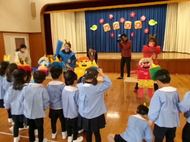鬼に見立てた籠に、豆を投げ入れたり、鬼役の職員が背負った籠を狙って投げて、全員で楽しみました!元気よく「鬼は外、福は内」と言う姿や、福の神に扮した園長先生にお土産の豆をもらい喜んでいました。お家でも、是非かわいいお面を使って、豆まきをしてみてくださいね♪