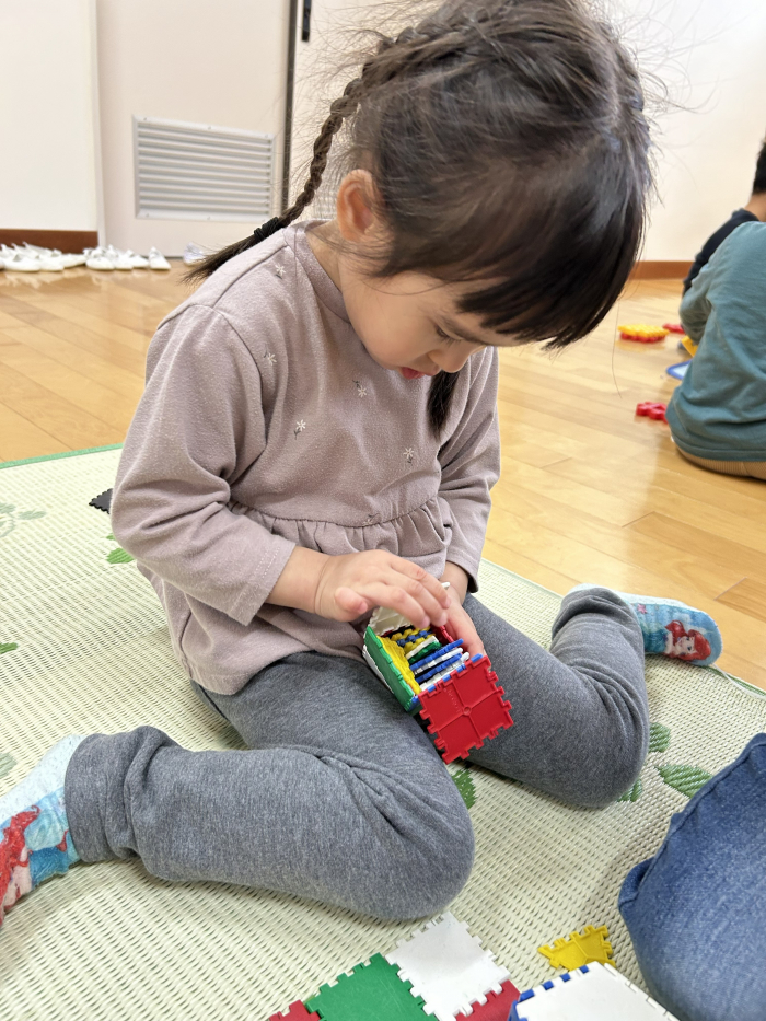 今日も、ブロックを壁に貼ったり、組み立てて中に詰めたりと思い思いに遊ぶ遊び博士の子ども達でした!