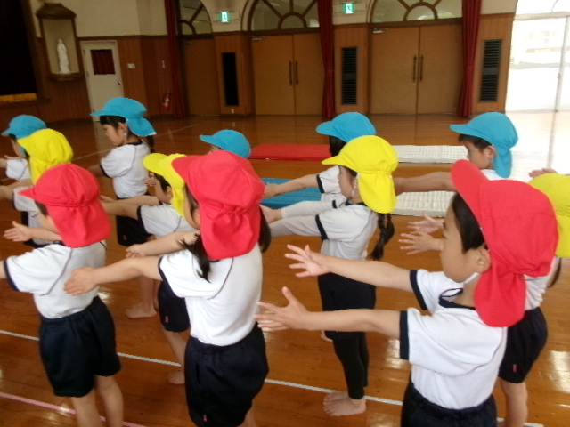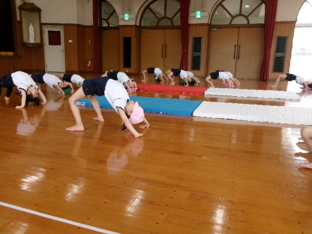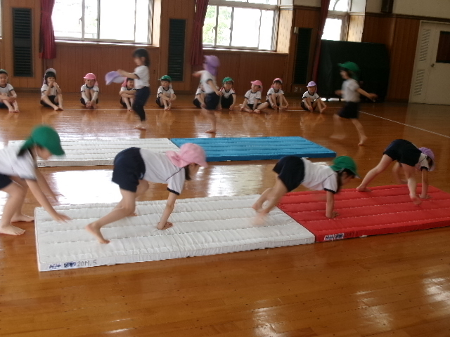 今日は、A組さんがカワイの体操でした。今年度初めての体操にワクワクの子どもたち☆気を付けの姿勢から始まり、様々な技に挑戦しました。最初は心配そうな表情をしていましたが、だんだんと真剣な表情で取り組めていました。ブリッジや2人組の技も何度かすると、自分の力で頑張ろうと一生懸命でした。これからも楽しく、体をどんどん強くしていきましょう♪