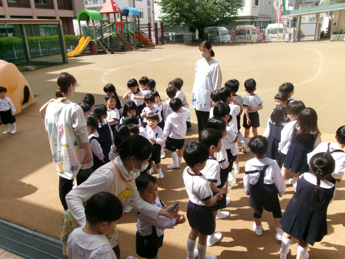 初めての放送や非常ベルの音を聞き、クラスごとに避難経路を確認しました。子どもたちは、真剣に話を聞き、約束事を守って行動することが出来ていました!