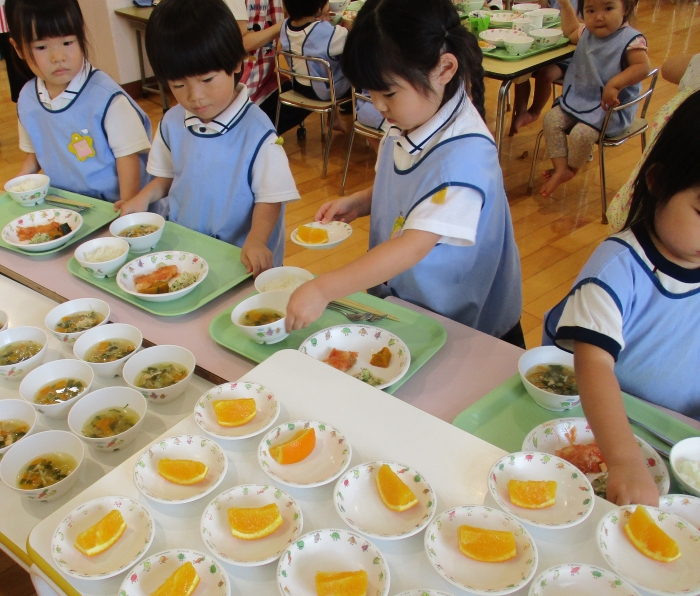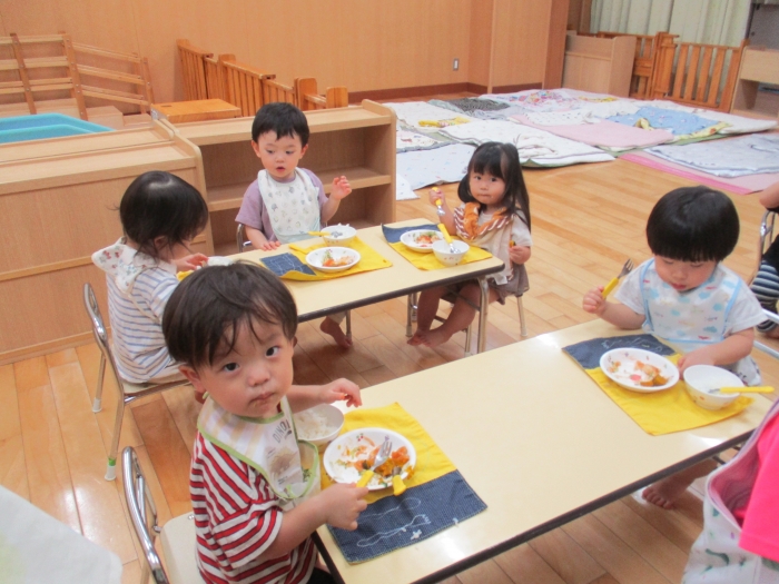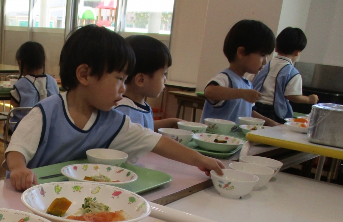わかば組もランチルームを利用し始め、自分で給食を席まで運び、上手に食べていました。